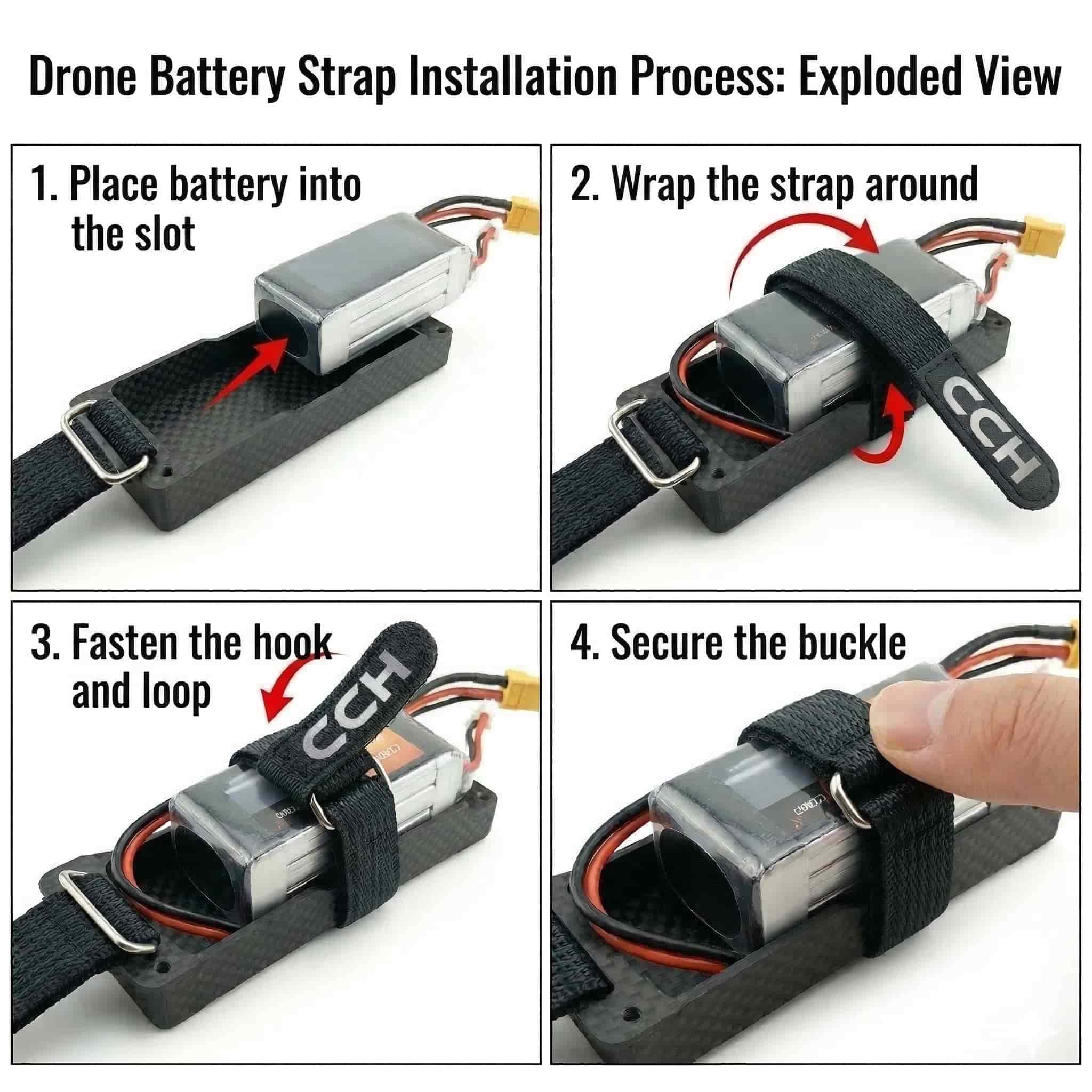 Der rutschfeste Klettverschluss von CCH besteht aus hochwertigem Nylon mit einer rutschfesten Beschichtung für sicheren Halt der Batterie.